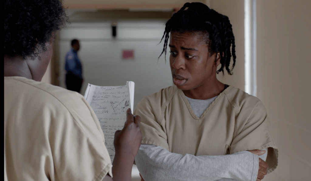 My summer love, Orange is the New Black, has given us one of the greatest most disturbing meta stories ever: The Time Hump Chronicles. Crazy Eyes’s erotic fiction that she penned for drama class is the highlight of the show’s third season, and makes me wish it was real. The closest thing we have to it is what the script writers came up with and had actress Uzo Aduba scrawl onto curly sheets of worn paper. That is “Suzanne Warren’s” actual handwriting, and Aduba has admitted that there is a full story written out there. Can we ever hope to read it in its entirety? Praise Norma that it may be so. Until then, I have done my level best to reconstruct what the show has actually revealed to us on the written page. This is no fan fiction. You will find no poster mock-ups or vampires, especially because they’re so derivative. This is the actual text as written by our very special Crazy Eyes.