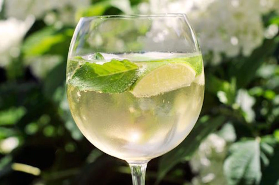 Combine in a wine glass. Boom. I mean, you may want to squeeze the lime and muddle the mint leaves a bit, but no need to get too precious.