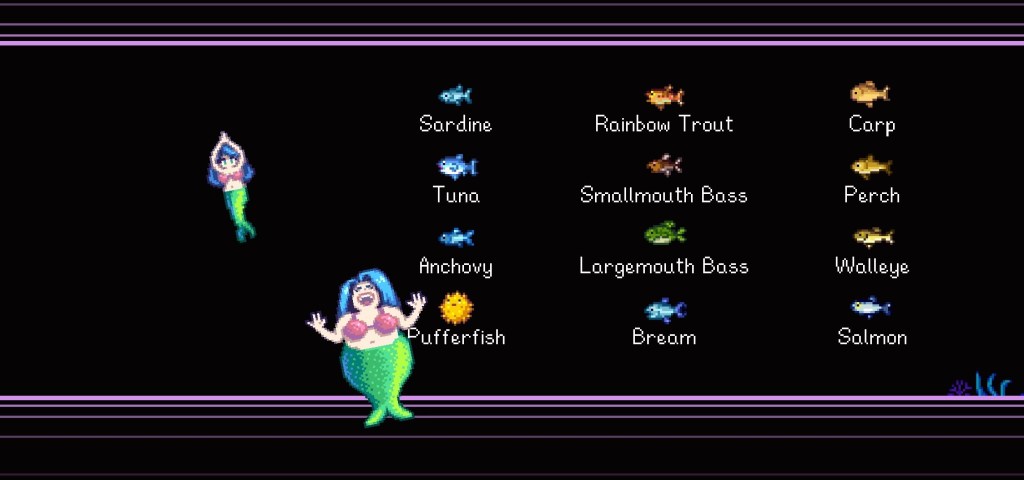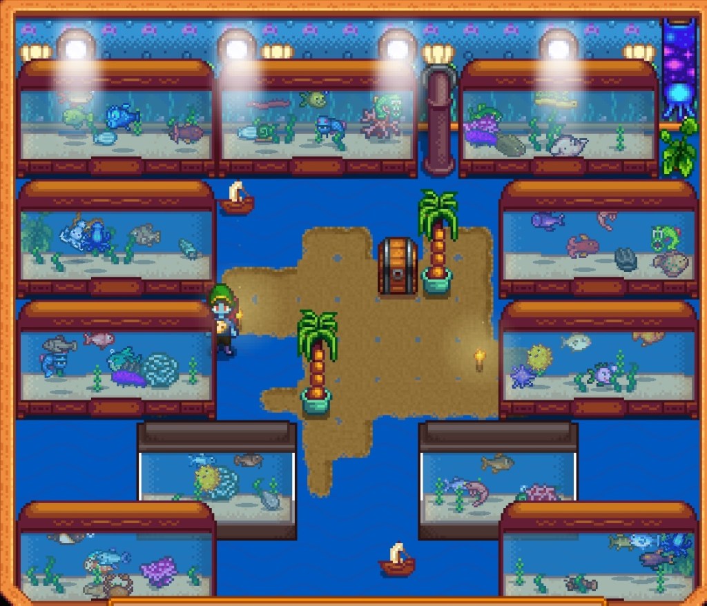 Let’s now venture over to our Very Fine Aquarium, featuring magnificent specimens from the waters of Stardew Valley and Ginger Island. It’s just plain hypnotizing to watch them swim around, blissful in their captivity.