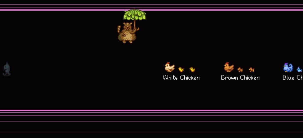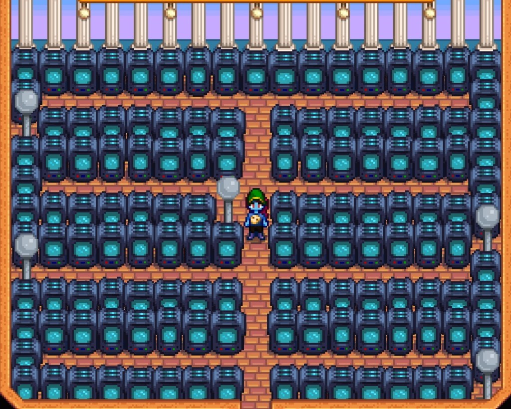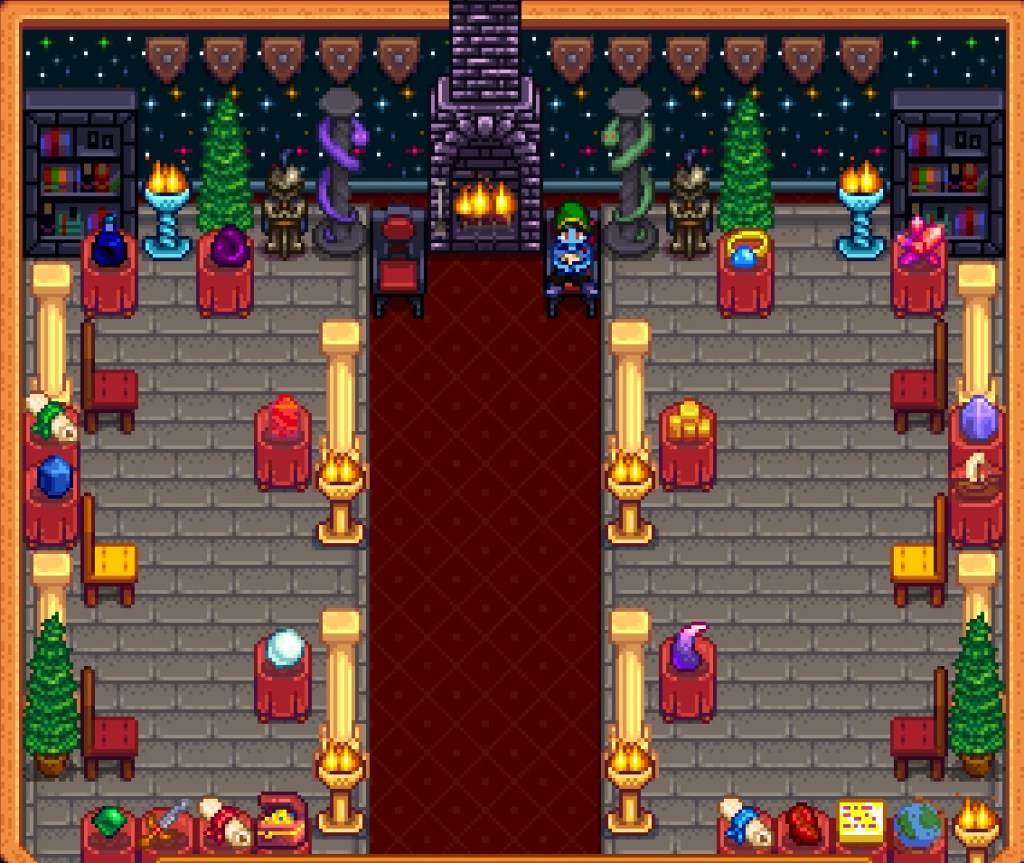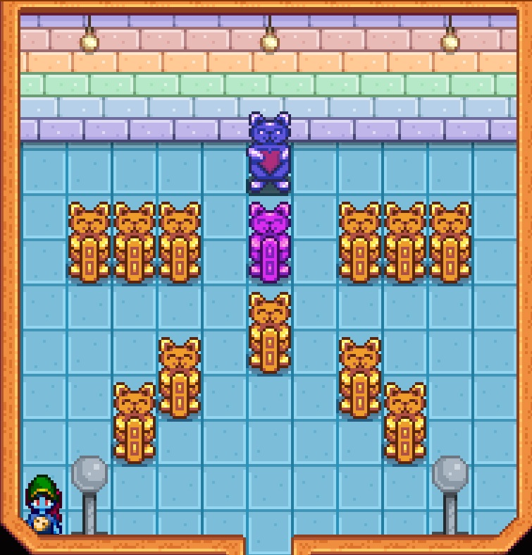 Next is the Rainbow Treasure Room, generating a variety of surprise treasures everyday along with a daily iridium ore and prismatic shard. These magical statues celebrate wealth and perfection–nay, TRUE perfection. Or it’s a cat cult and Clyde’s been harvesting a lot of stolen goods. Either way, we don’t ask questions.