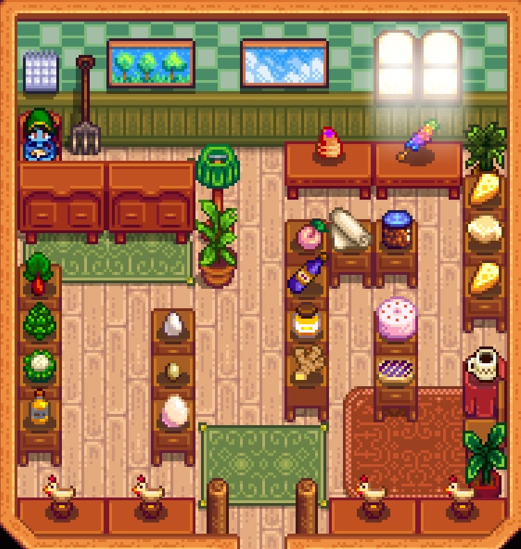 Feeling inspired by the riches and bounty of the farm, be sure to pop by The Tipsy Chicken General Store, featuring the farm’s best cheeses, baked goods, wine, fabrics, and more. Don’t worry, now, none of the farm-fresh goods in the store compete with Pierre (even though he’s a moody little bastard with a bloodlust for rabbits’ feet). We also have an ample supply of souvenir chicken statues, in case you and your entire town each need one.