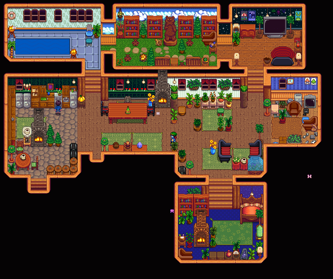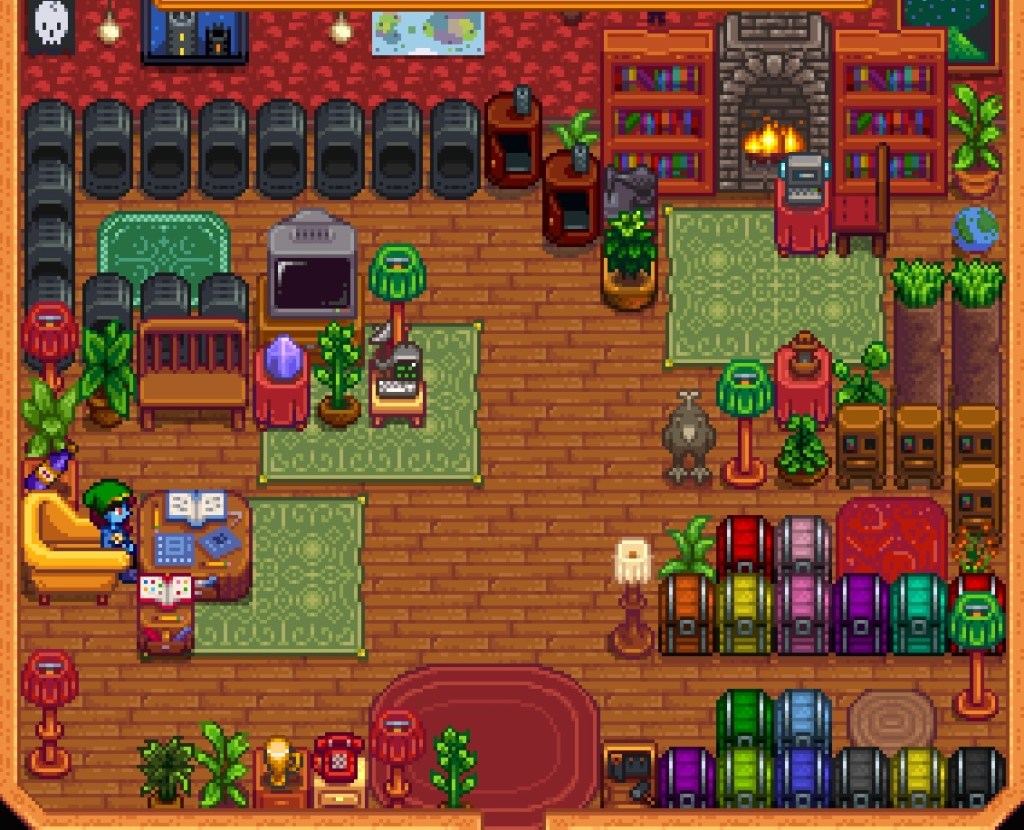 The indoors is about anything other than productivity. This is the place to kick back and hide from the Stardew Villagers who are over at the resort overpaying for sunscreen and beach towels. Especially Lewis.