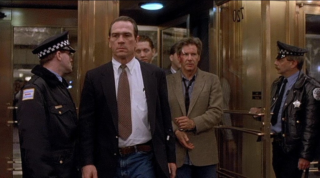 Picture it: Harrison Ford stars as a (spoilers!) wrongly convicted wife murderer who escapes imprisonment and eludes U.S. Marshall Tommy Lee Jones while attempting to find the real murderer. It has egg sandwiches, prosthetic arms, and a parade. What more could you want?